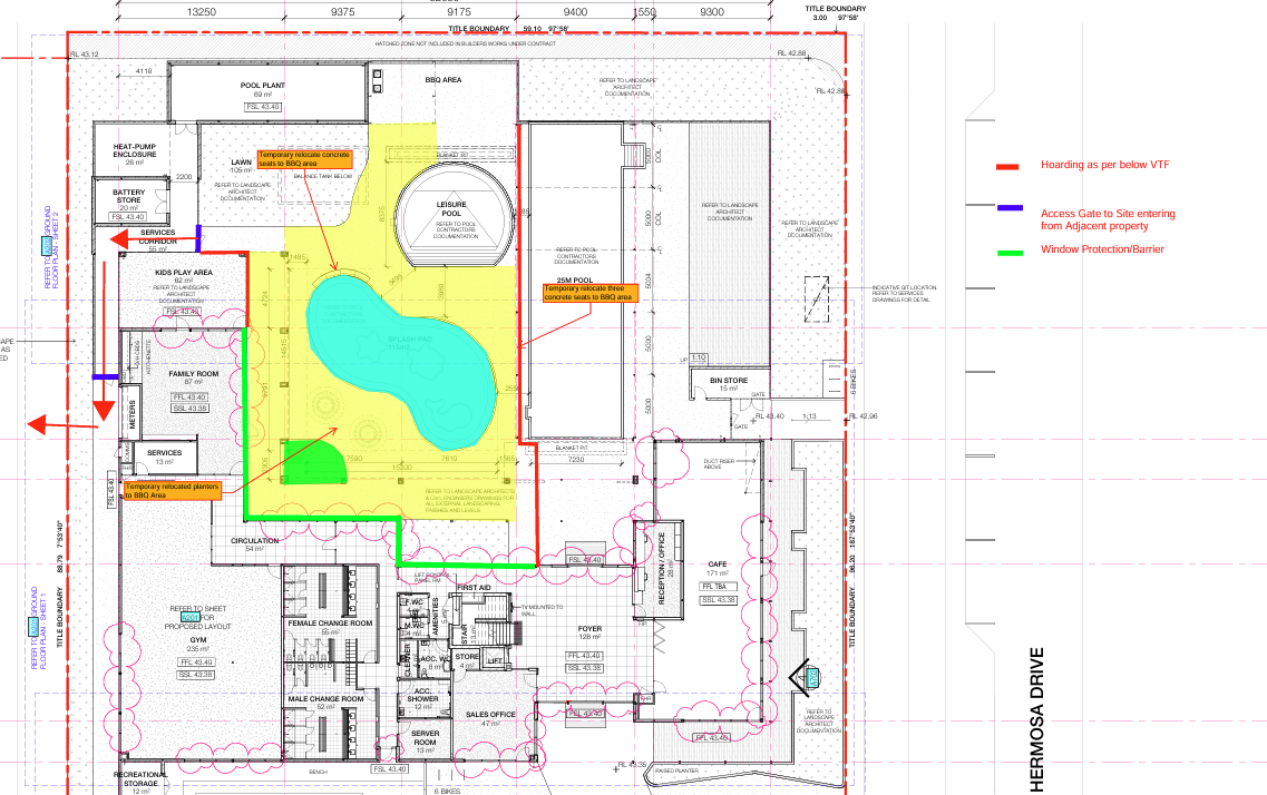 - The extent of the temporary hoarding is shown by the solid red line.